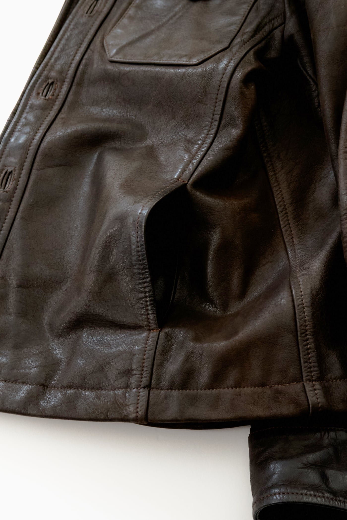 胸元のフラップポケットに加え、レザーシャツには珍しい
