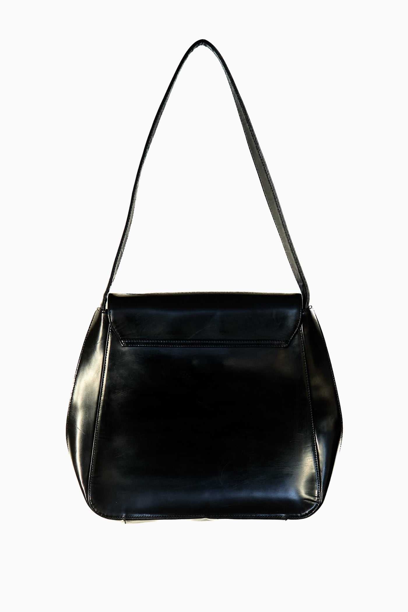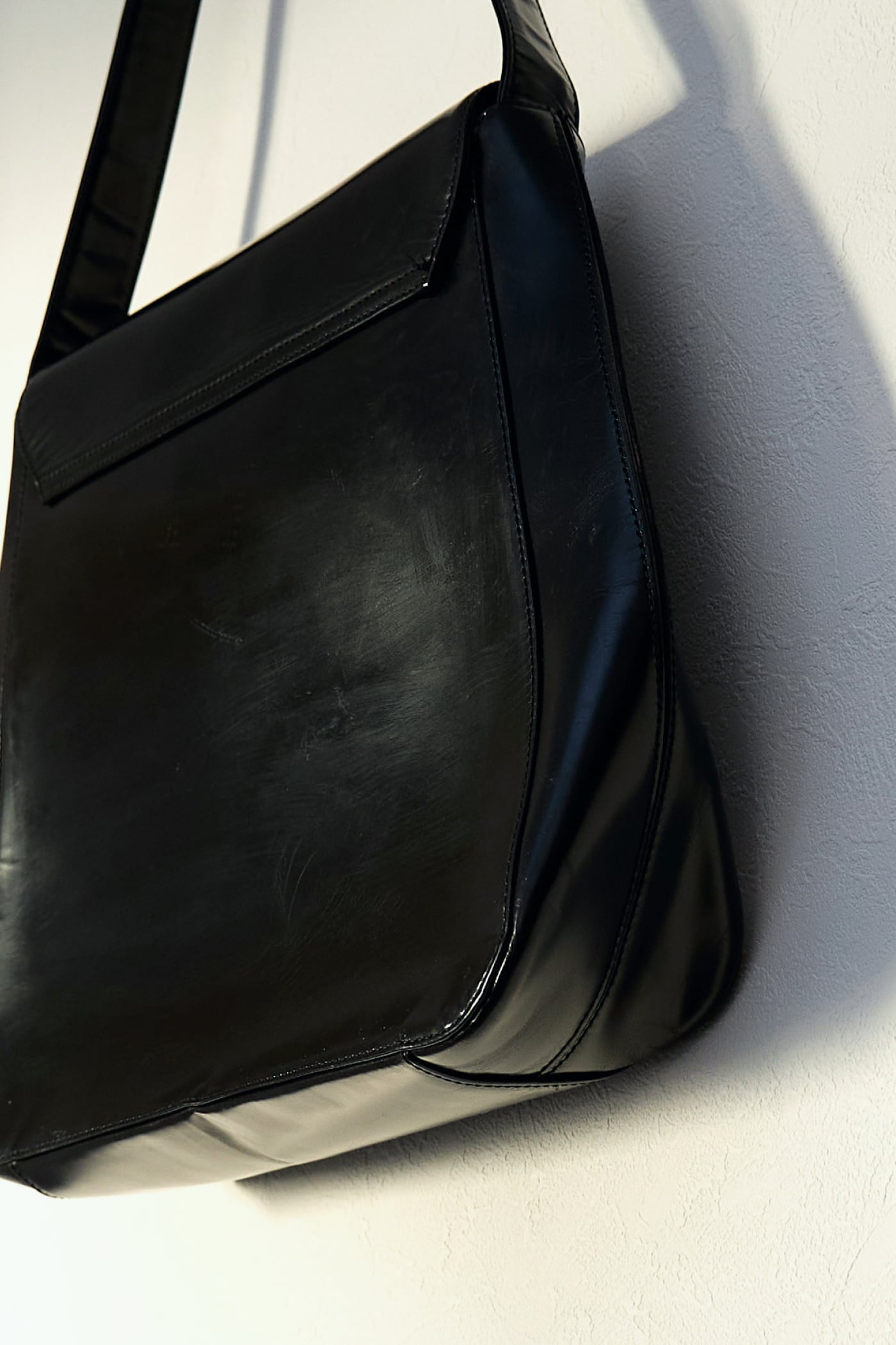 最大の特徴は、鏡面のように美しく磨き上げられたエナメルレザーの光沢感。