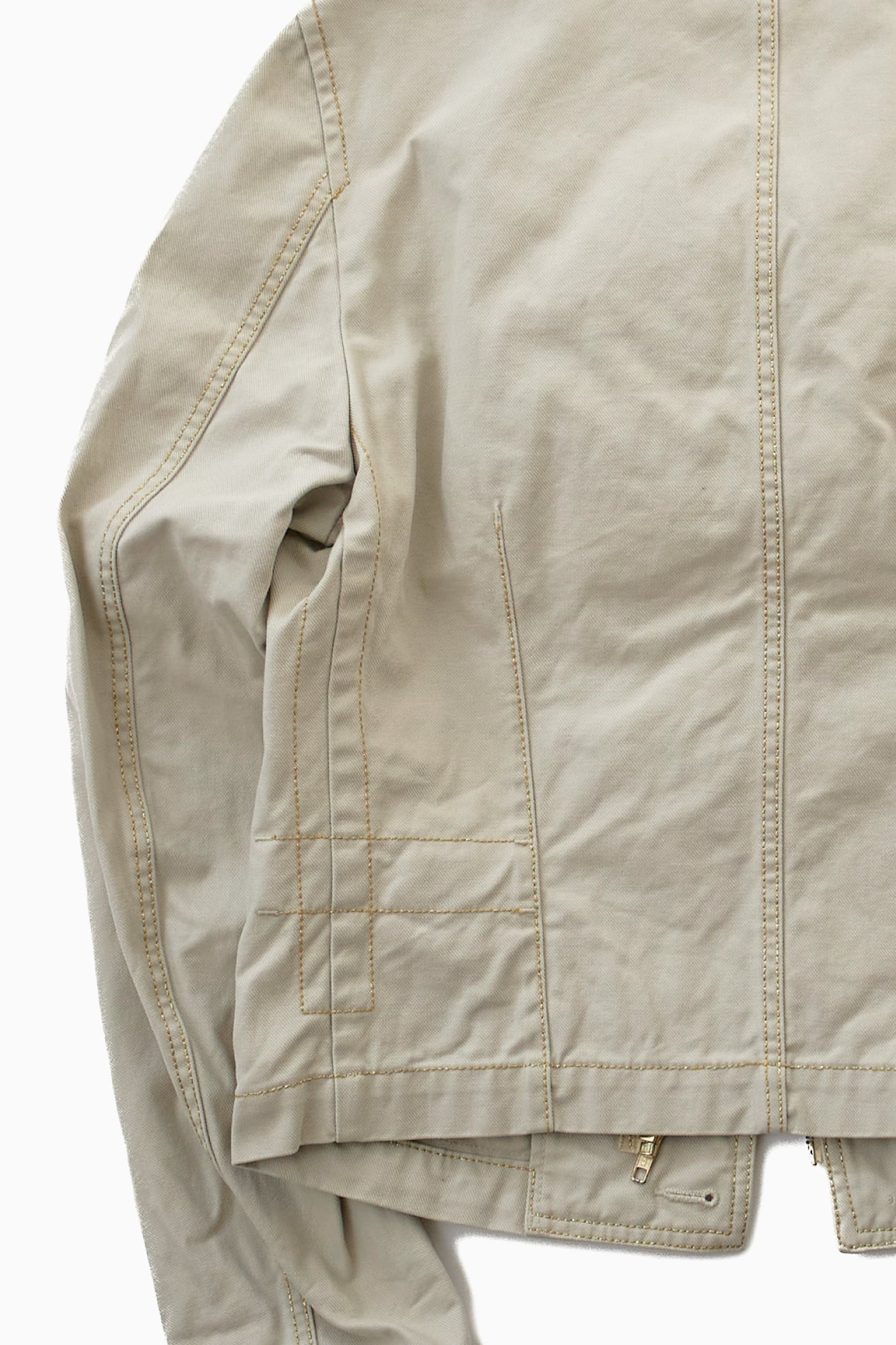デニムジャケットを、金色のステッチワークで