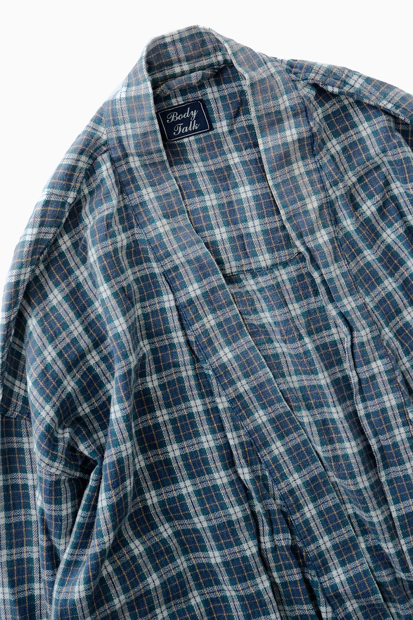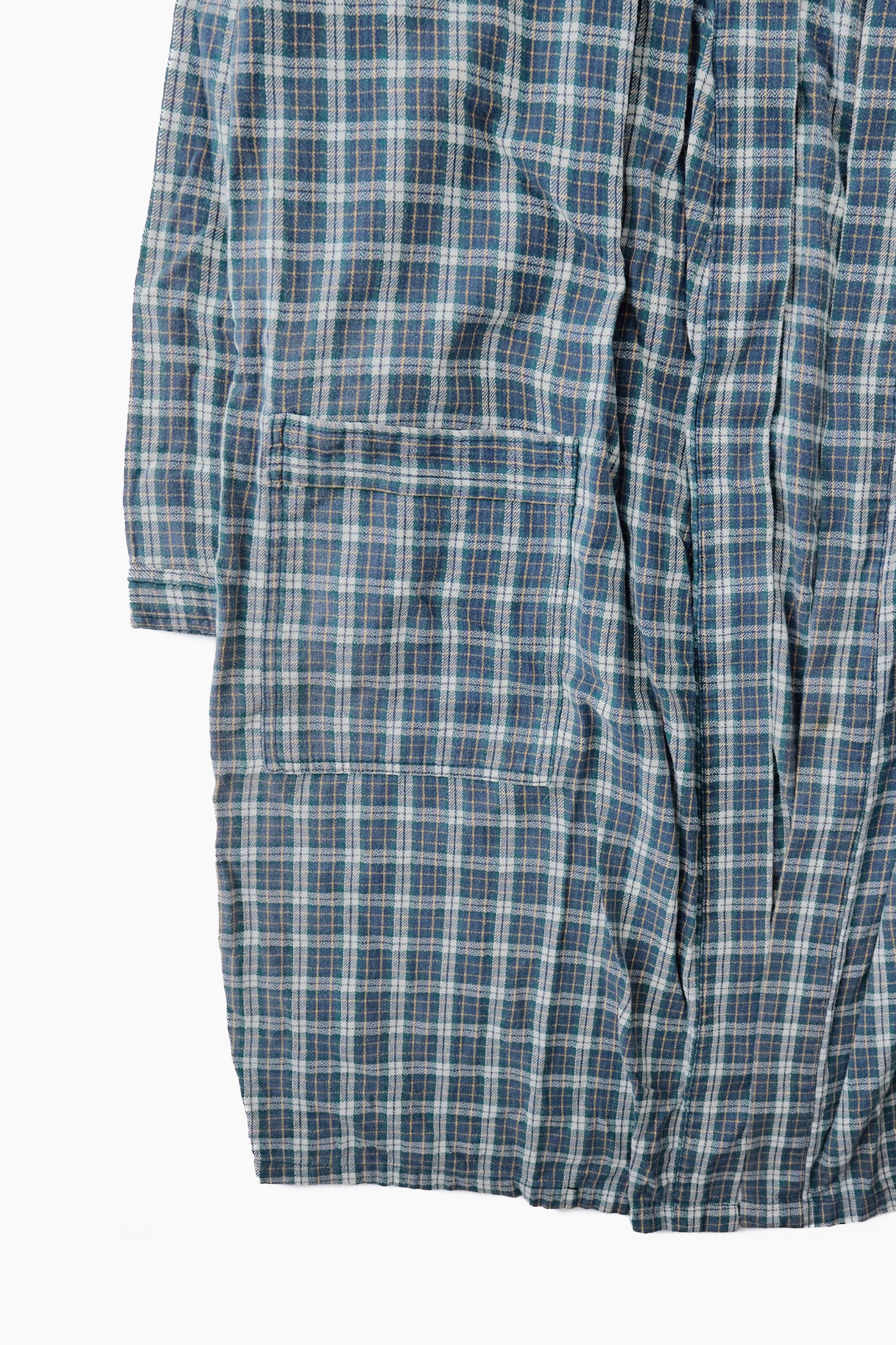 落ち着いたブルーをベースに、ホワイトやイエローのラインが交差するチェック柄は、どこか懐かしさを感じさせる絶妙な配色で仕上がっています。フロントにはあえてボタンなどの留め具を設けないオープン仕様を採用しており、カーディガンのように風を孕んでなびく軽やかなシルエットを楽しめます。首元から裾へと続くショールカラーのような襟のラインと、両サイドに配された大ぶりなパッチポケットが、リラックスしたエフォートレスなムードをさらに引き立てています。