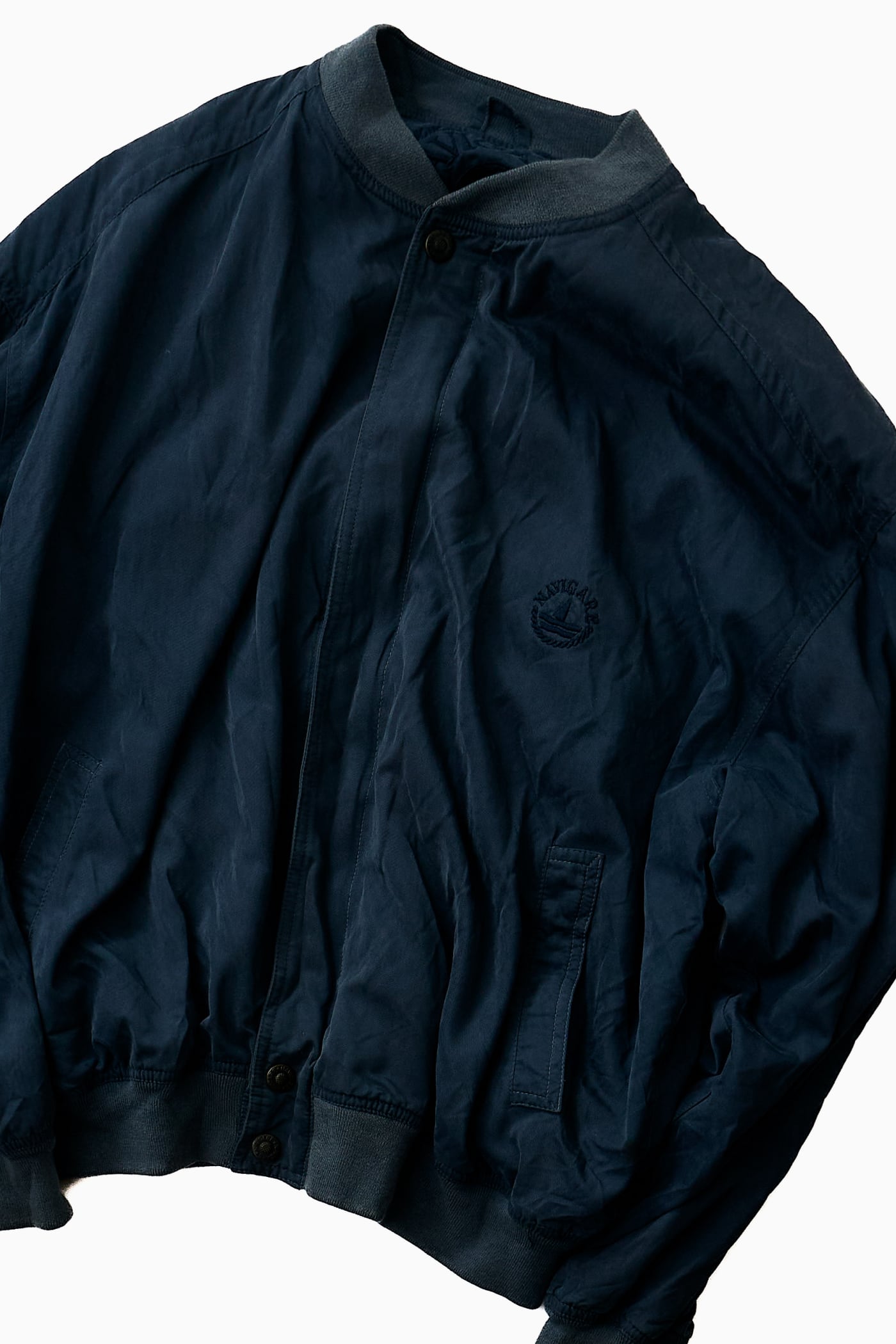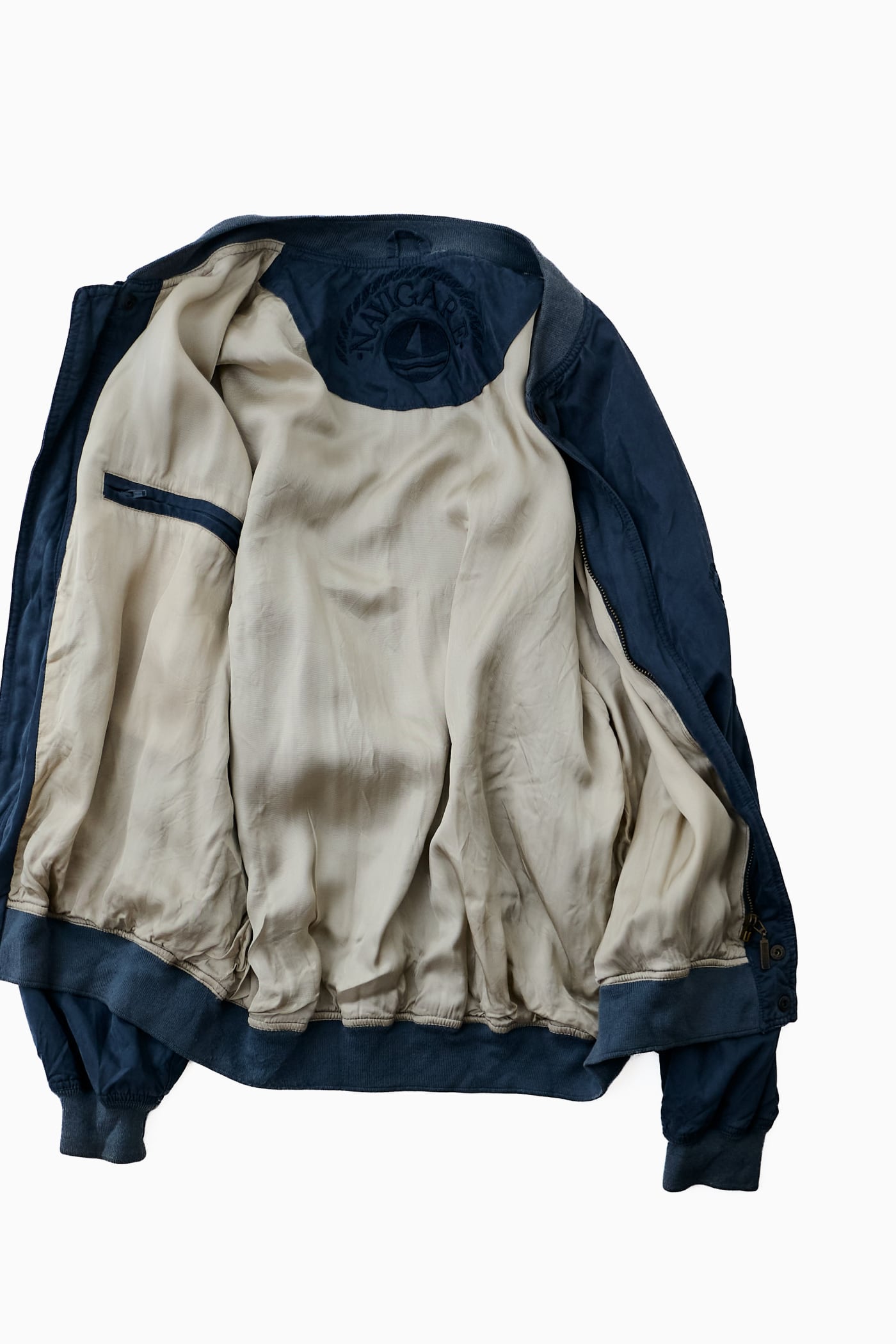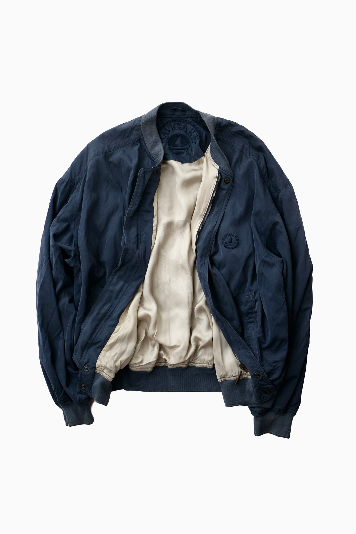 MA-1やフライトジャケットを彷彿とさせるリブ付きのボンバー型でありながら、どこか肩の力が抜けたエレガントなムードが漂うのは、ユーロヴィンテージならではの魅力です。